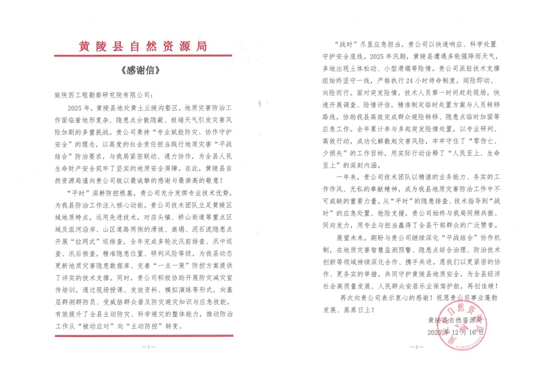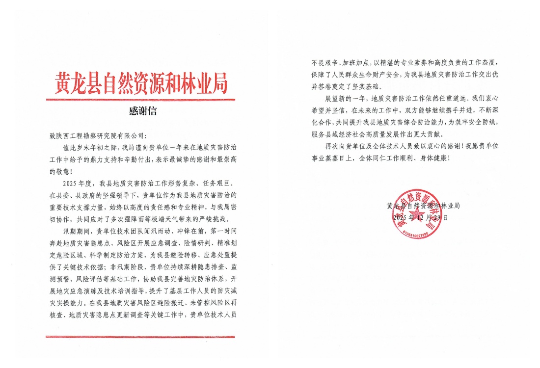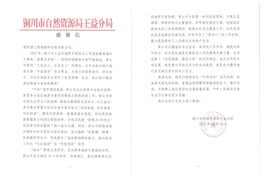 近日,公司接連收到黃陵縣、王益區(qū)、黃龍縣自然資源部門發(fā)來的感謝信,對(duì)公司在2025年度地質(zhì)災(zāi)害技術(shù)支撐工作中表現(xiàn)出的專業(yè)能力、高效響應(yīng)與奉獻(xiàn)精神給予高度評(píng)價(jià)和誠摯感謝。