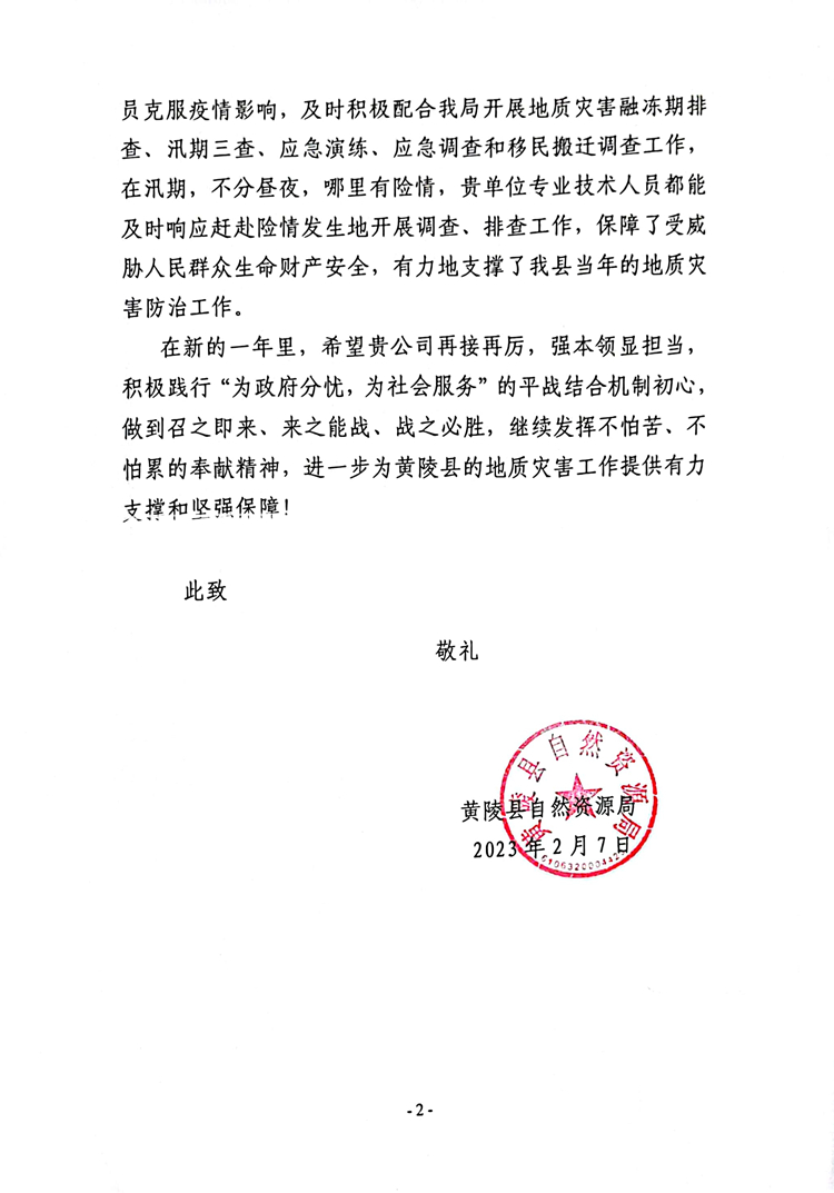 一封感謝信,紙短情長(zhǎng)。2月17日,陜西工勘院收到一封來(lái)自黃陵縣自然資源局送來(lái)的感謝信,這對(duì)公司平戰(zhàn)結(jié)合技術(shù)支撐組各位成員來(lái)說(shuō)既是“意外驚喜”又在“意料之中”,是對(duì)我公司平戰(zhàn)結(jié)合技術(shù)支撐工作的認(rèn)可,更是對(duì)公司地質(zhì)災(zāi)害防治領(lǐng)域技術(shù)實(shí)力的肯定。