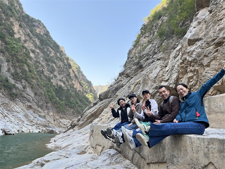 在一路歡聲笑語中,大家到達了鄭國渠景區(qū)。沿著山邊步道,拾級而下,賞春踏青,開啟了涇河漫步之旅。山的崎嶇呼應(yīng)著峽的險峻,水的靈秀映襯著石的詭譎,完美的詮釋了大自然的鬼斧神工。大家行走在棧道隧洞之間,相伴于碧水藍天之際,工作一周的疲憊已然消散不見。