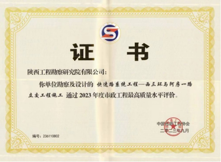 該獎項由中國市政協(xié)會組織實施,代表市政工程行業(yè)同時期國內(nèi)先進水平,獲獎要求高,評選程序嚴格,是我國市政行業(yè)在工程質(zhì)量方面的最高榮譽。此前由我公司負責勘察的西三環(huán)與阿房一路立交工程施工項目獲2023年度市政工程最高質(zhì)量水平評價,今年西銅高速城市段快速路工程(鳳城十二路-秦漢大道立交南)市政工程又獲2024年度市政工程最高質(zhì)量水平評價。連續(xù)兩年榮獲該項“國字”榮譽,充分展示出公司近年來在勘察領(lǐng)域扎實的專業(yè)功底及人才培養(yǎng)方面取得的突出成效。